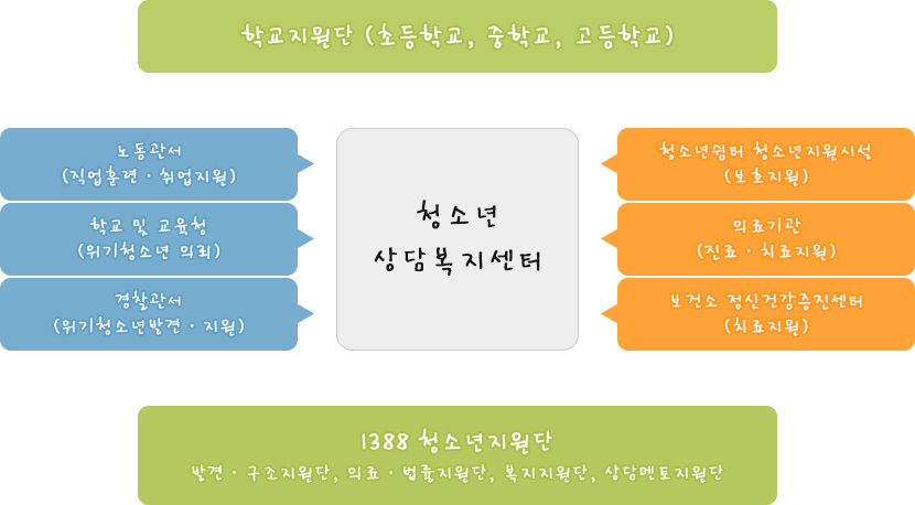 청소년안전망은 지역사회 시민 및 청소년 관련기관, 단체들이 위기상황에 처한 청소년을 발견.구조.치료하는데 참여하여 건강한 민주시민으로 성장하도록 지원하기 위해 협력하는 연계망입니다.